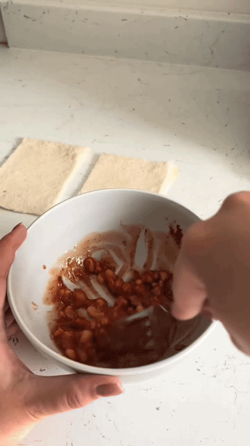 Mash your beans with some tomato puree before spreading on your flattened bread. Soak in milk before adding to a frying pan for a couple of mins.